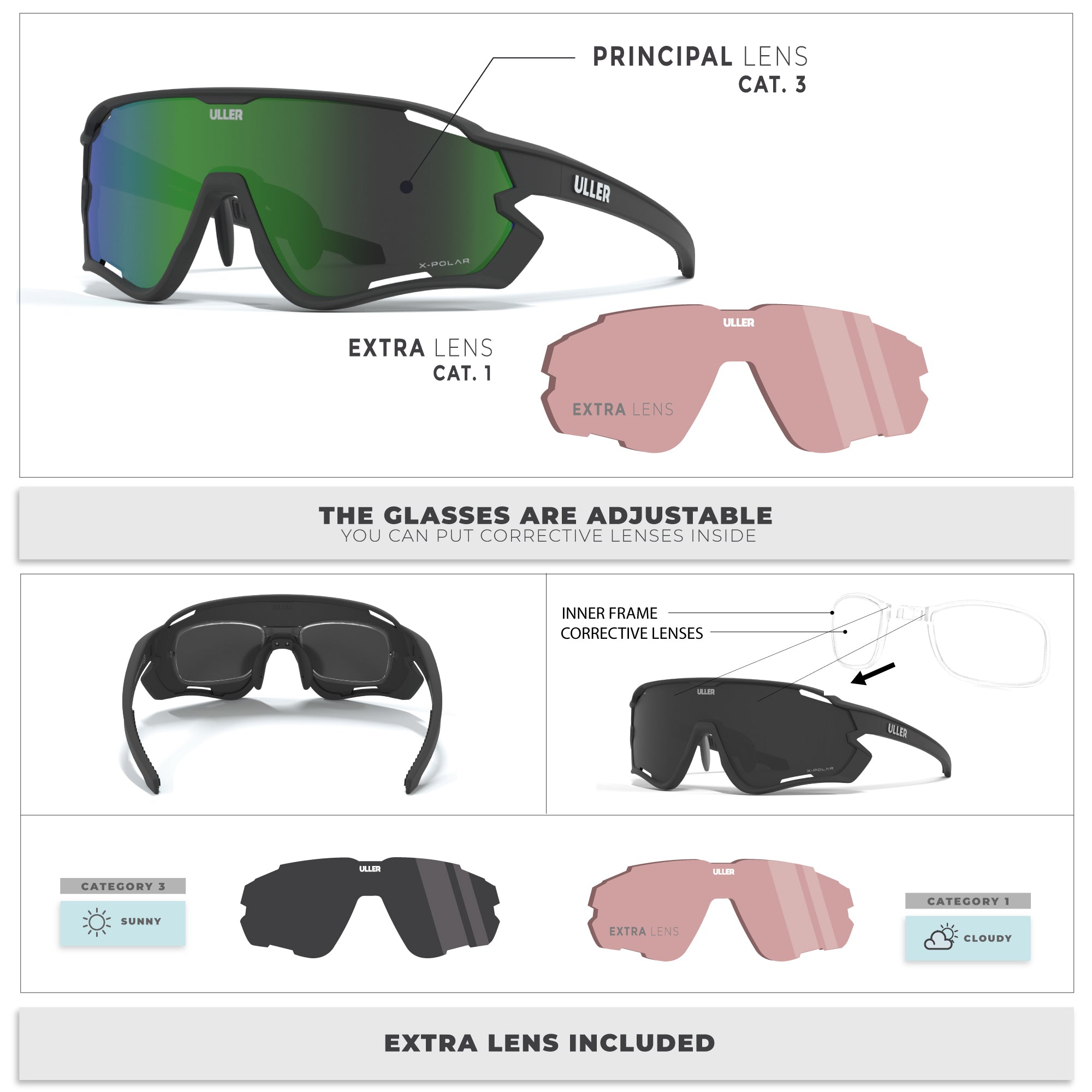 Todas las gafas deportivas Uller® están fabricadas con los mejores materiales del mercado para cubrir las mayores exigencias a las que las someten los deportistas de élite y alto rendimiento. También son graduables gracias a la pequeña montura interna que tiene, apta para poner lentes correctoras.